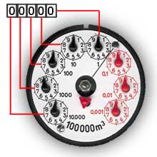 La lettura si esegue leggendo le lancette nere: il contatore va letto in senso orario, da sinistra a destra, cominciando dalla lancetta che indica le migliaia (x 1000). La lancetta si trova molto spesso posizionata tra due numeri: si considera il numero inferiore. Per esempio in questo caso la lancetta delle migliaia è posizionata tra il due ed il tre quindi si prenderà il valore 2. Con lo stesso metodo si procede a leggere le centinaia (x100), le decine (x10) e le unità (x1).